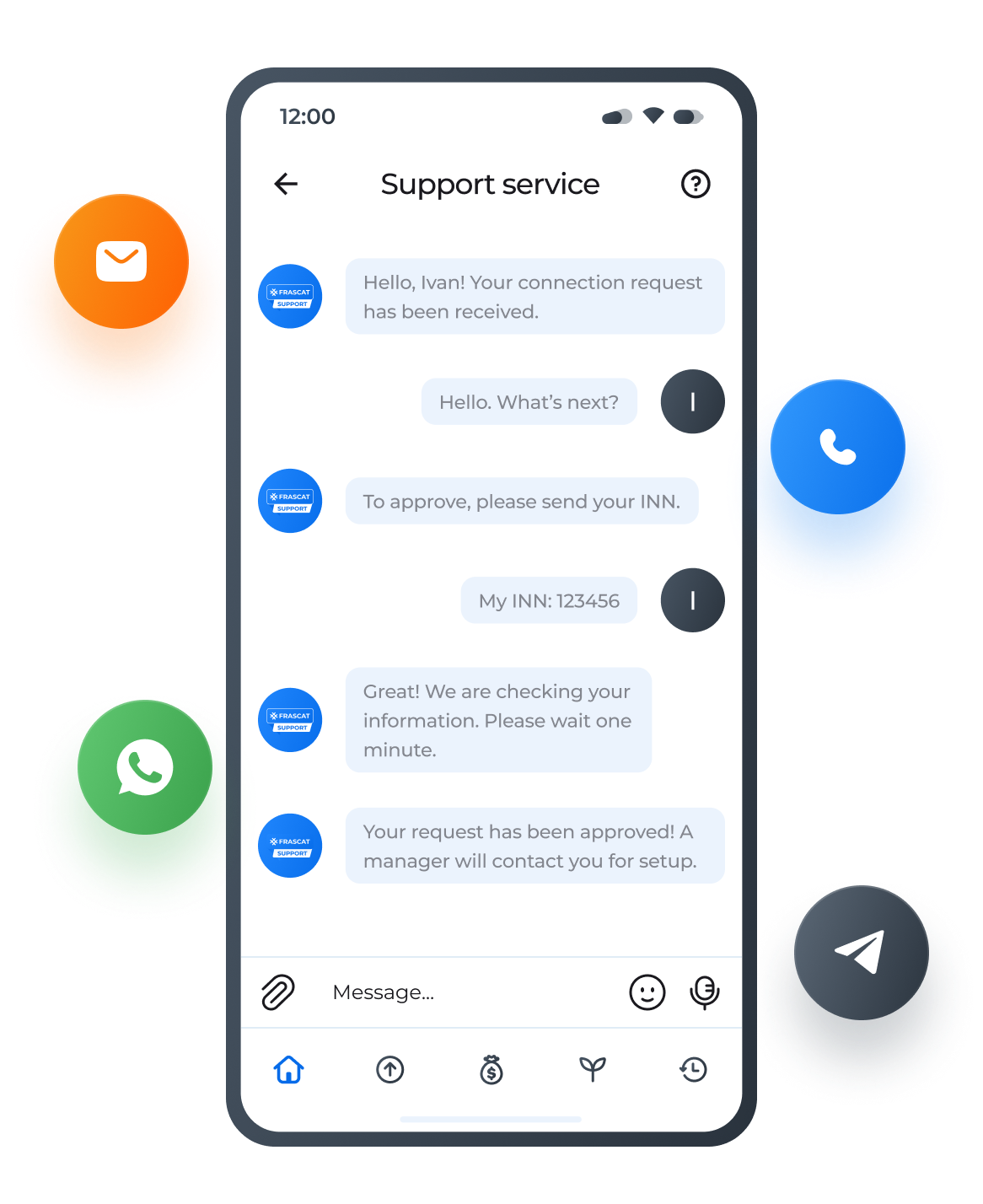 Payment is accepted via mPOS terminal, the functional solution is available via Telegram bot Frascat and mini-app. Suitable for couriers, taxis, mobile trade and other mobile teams.